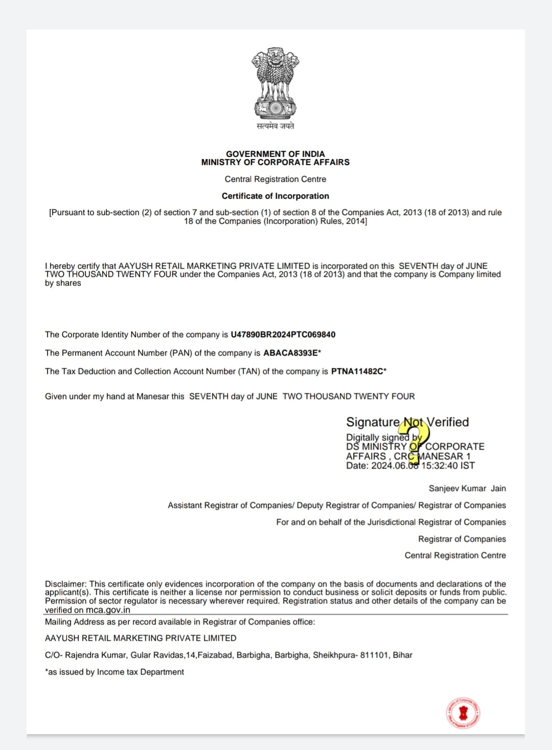 Copyright © 2024 for AAYUSH RETAIL MARKETING PVT. LTD